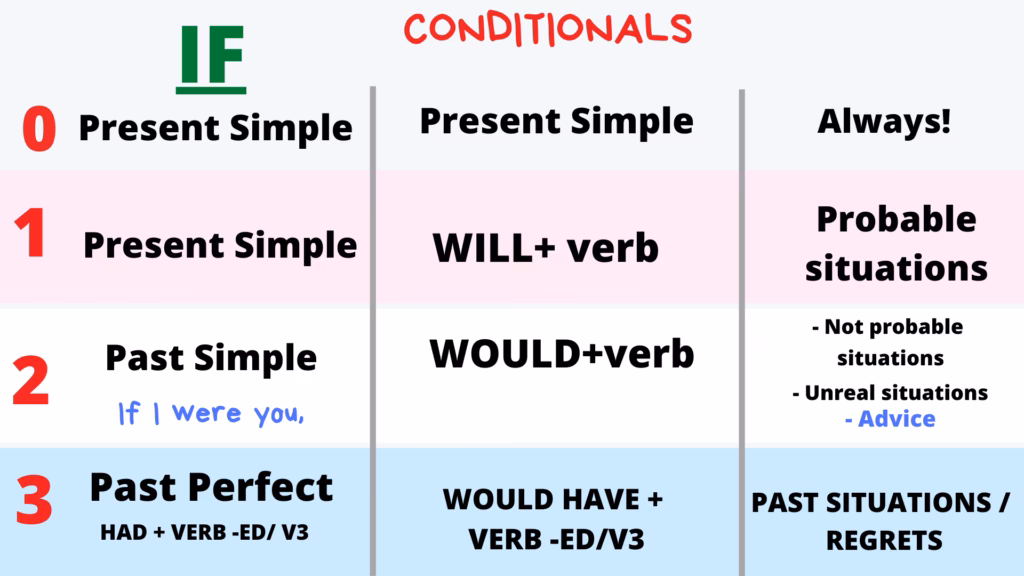 Para resumir las diferencias principales entre los condicionales 1, 2 y 3 (incluyendo el 0), podemos fijarnos en el tiempo verbal utilizado y el significado o la probabilidad que expresan: