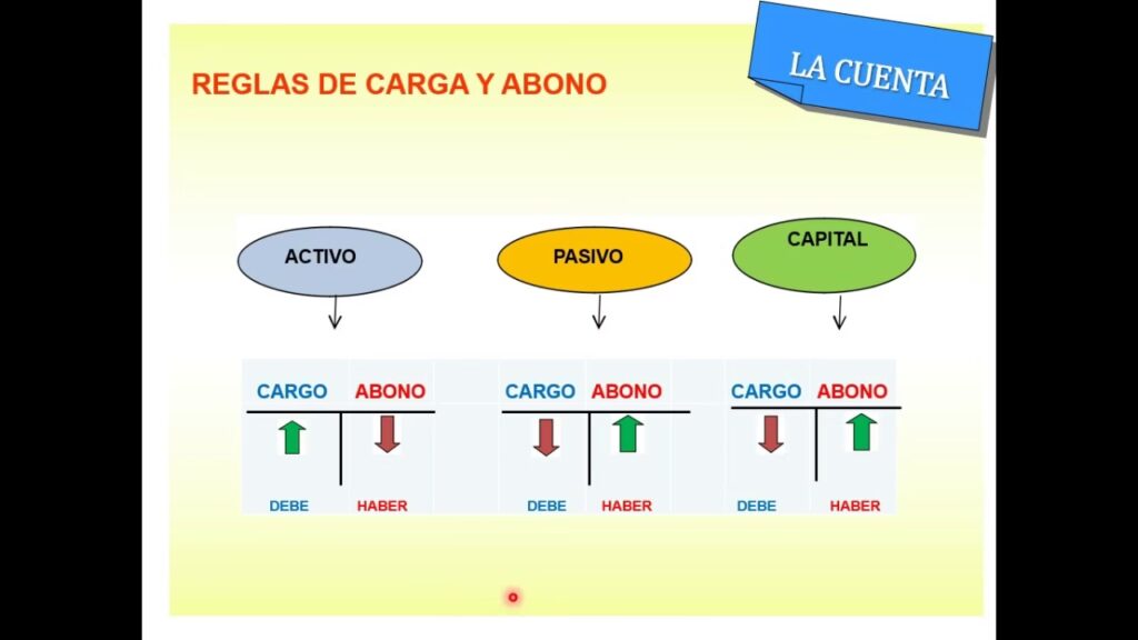 Para la mayoría de las cuentas de activo y gasto, un aumento se registra como un débito (cargo) y una disminución como un crédito (abono). Para las cuentas de pasivo, patrimonio e ingreso, un aumento se registra como un crédito (abono) y una disminución como un débito (cargo).