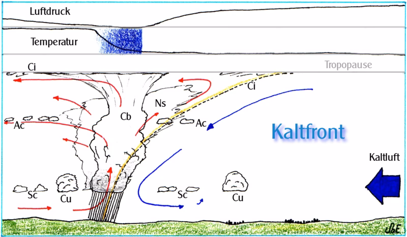 El aire frío, al ser más denso y pesado, se desliza por debajo del aire cálido y ligero, forzándolo a ascender. Este movimiento ascendente del aire cálido y húmedo es clave para la formación de nubes y precipitación. La atmósfera reacciona a este gradiente de temperatura intentando restaurar el equilibrio, lo que genera una circulación vertical a lo largo del frente: el aire asciende en la parte frontal y desciende detrás del límite frontal. Esta circulación es la fuerza real responsable de las nubes y la precipitación asociadas a un frente frío.