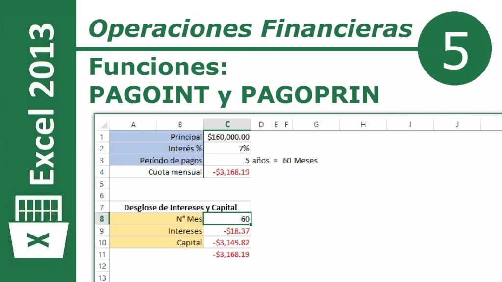 La relación entre PAGOINT, PAGOPRIN y PAGO es fundamental: para un período dado, el pago total (PAGO) es la suma del interés pagado (PAGOINT) y el capital pagado (PAGOPRIN), asumiendo que los pagos son constantes. Es decir, aproximadamente PAGO = PAGOINT + PAGOPRIN (la suma exacta puede variar ligeramente debido a redondeos en los cálculos internos de Excel, pero conceptualmente es así).